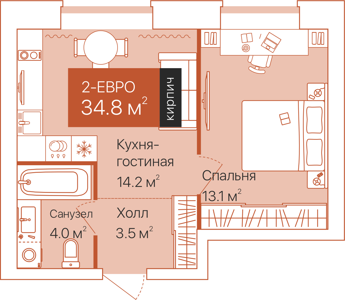 Небольшая площадь. Для первой квартиры и индивидуального проживания подходят студии, однокомнатные, евродвушки. В них достаточно места, чтобы организовать места для учёбы и отдыха, а в выходные позвать в гости родителей или друзей.