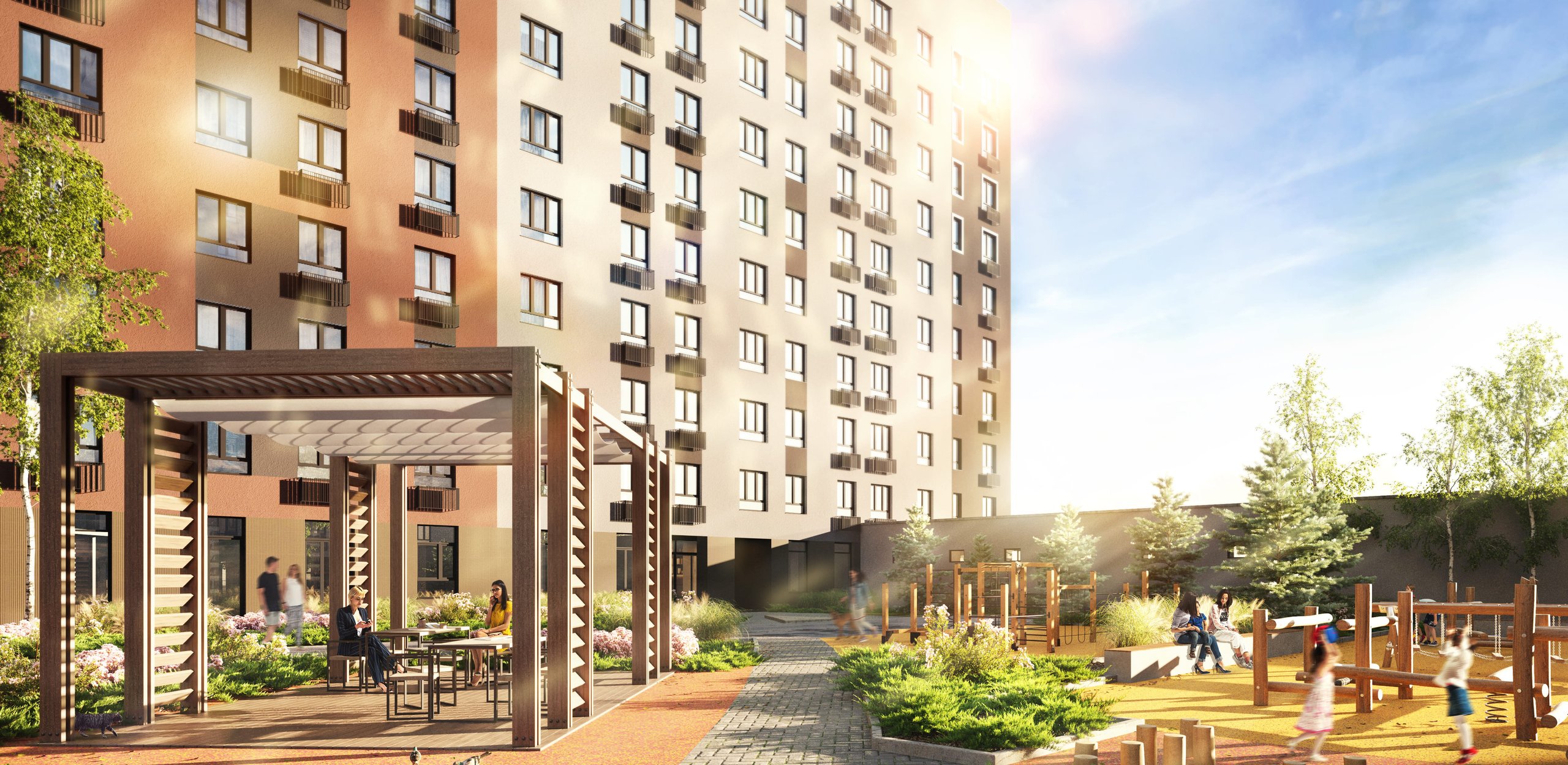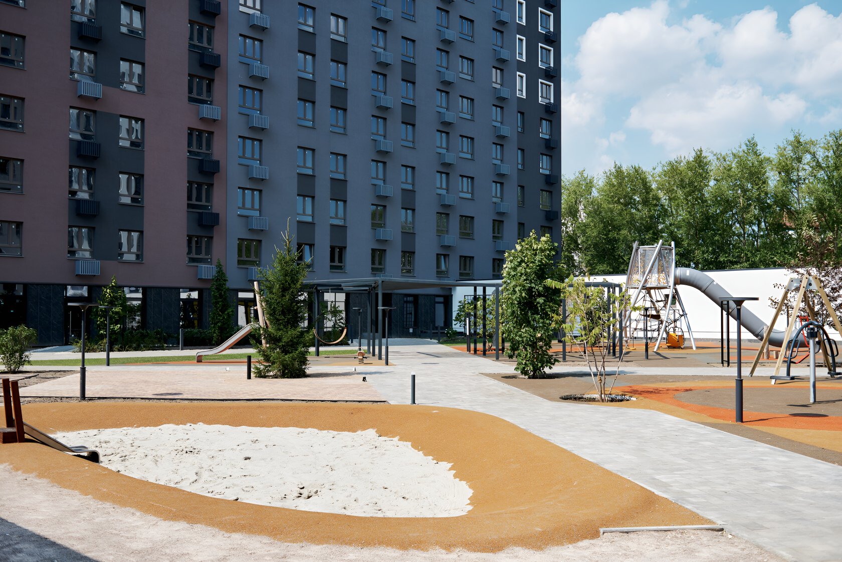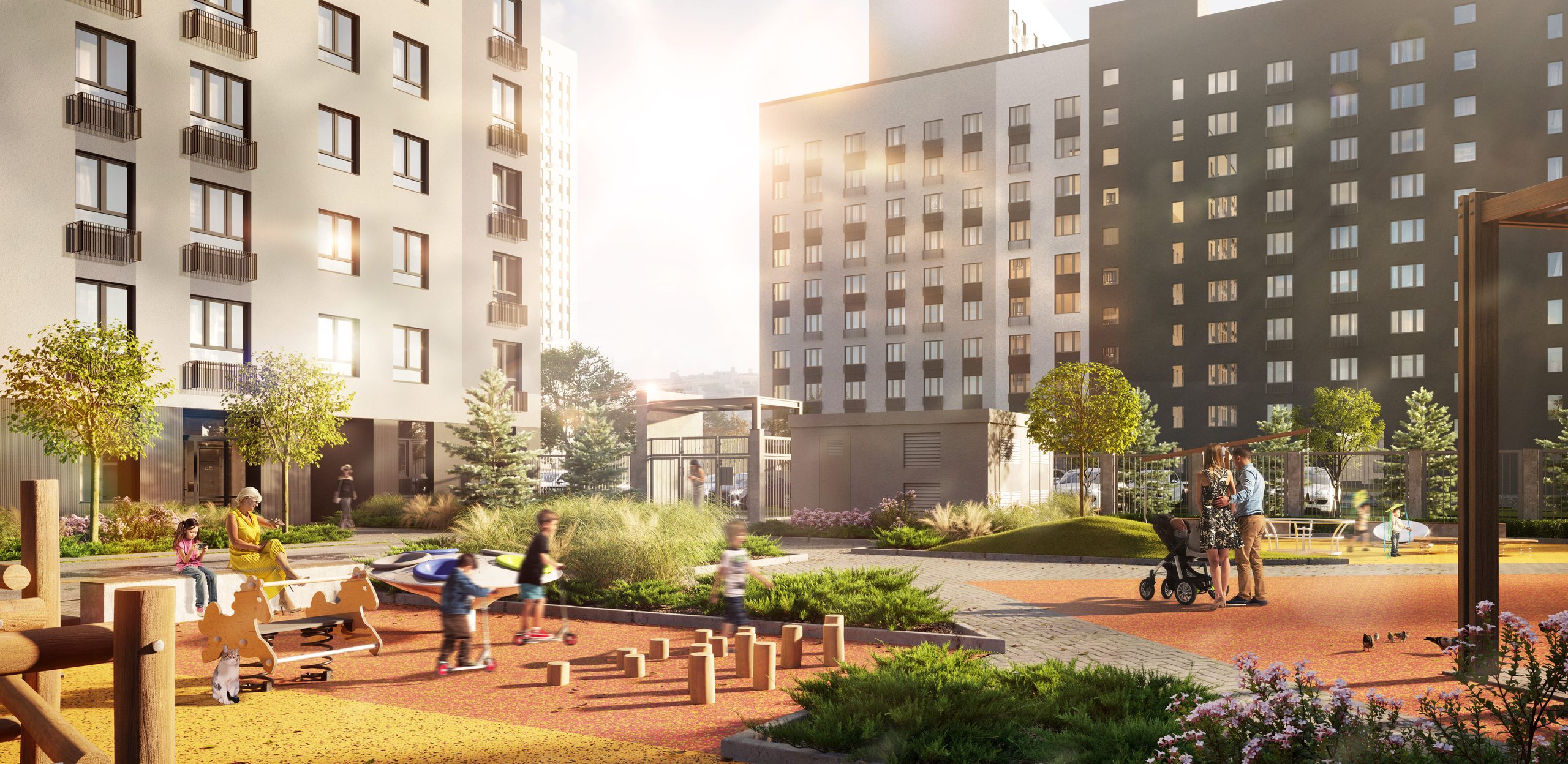 Здесь взрослые найдут место для отдыха вдоль торговой галереи, а детям всегда есть чем заняться на развивающих площадках. Окружение располагает: все парковочные места вынесены за территорию жилой зоны, а сам двор — закрыт. Вокруг зелень и тротуары для комфортных прогулок. Всё это совсем рядом с центром.