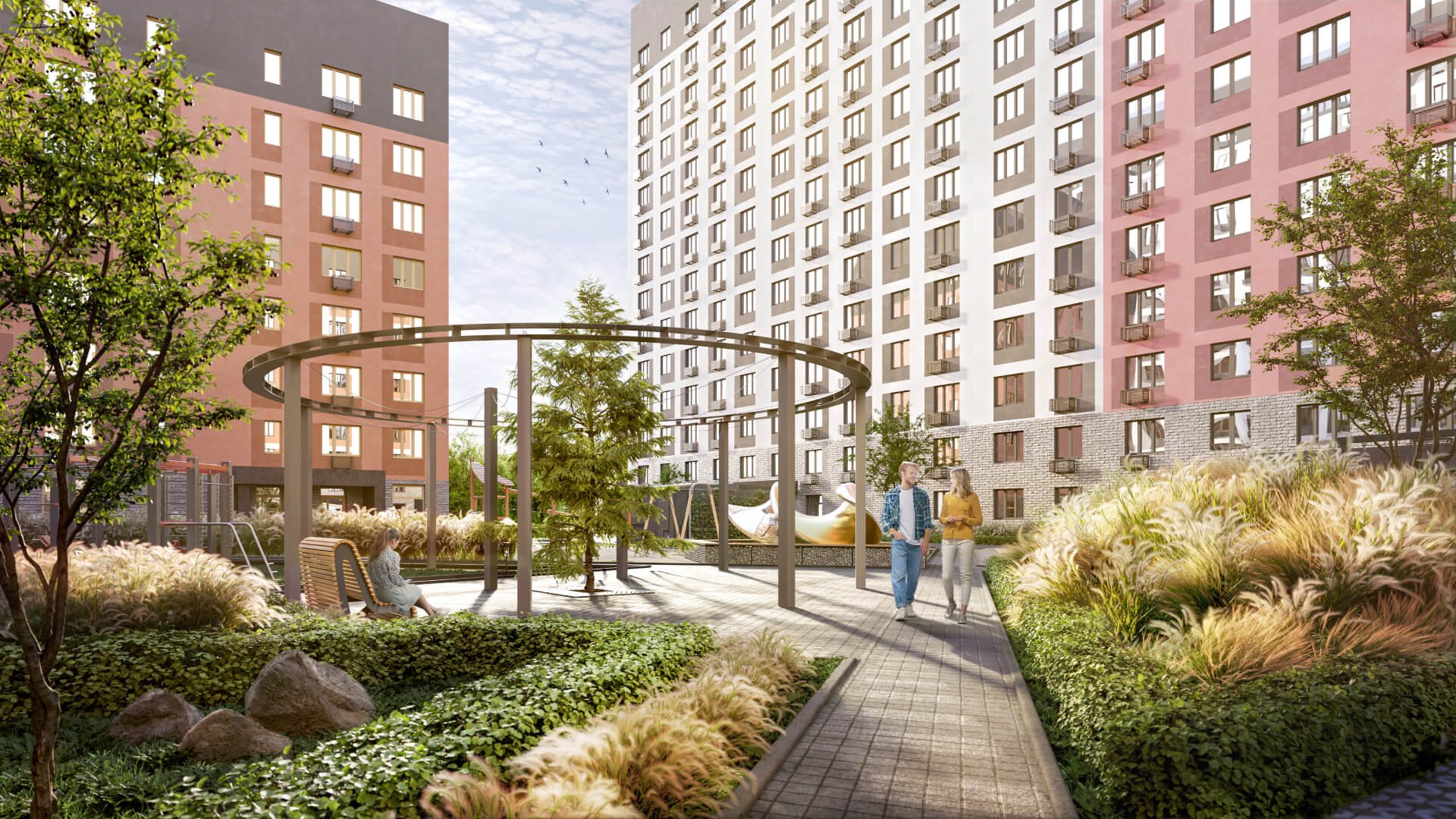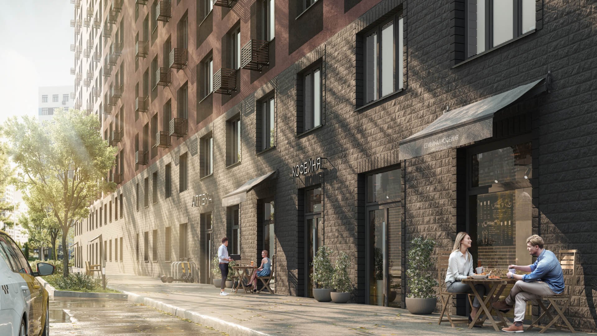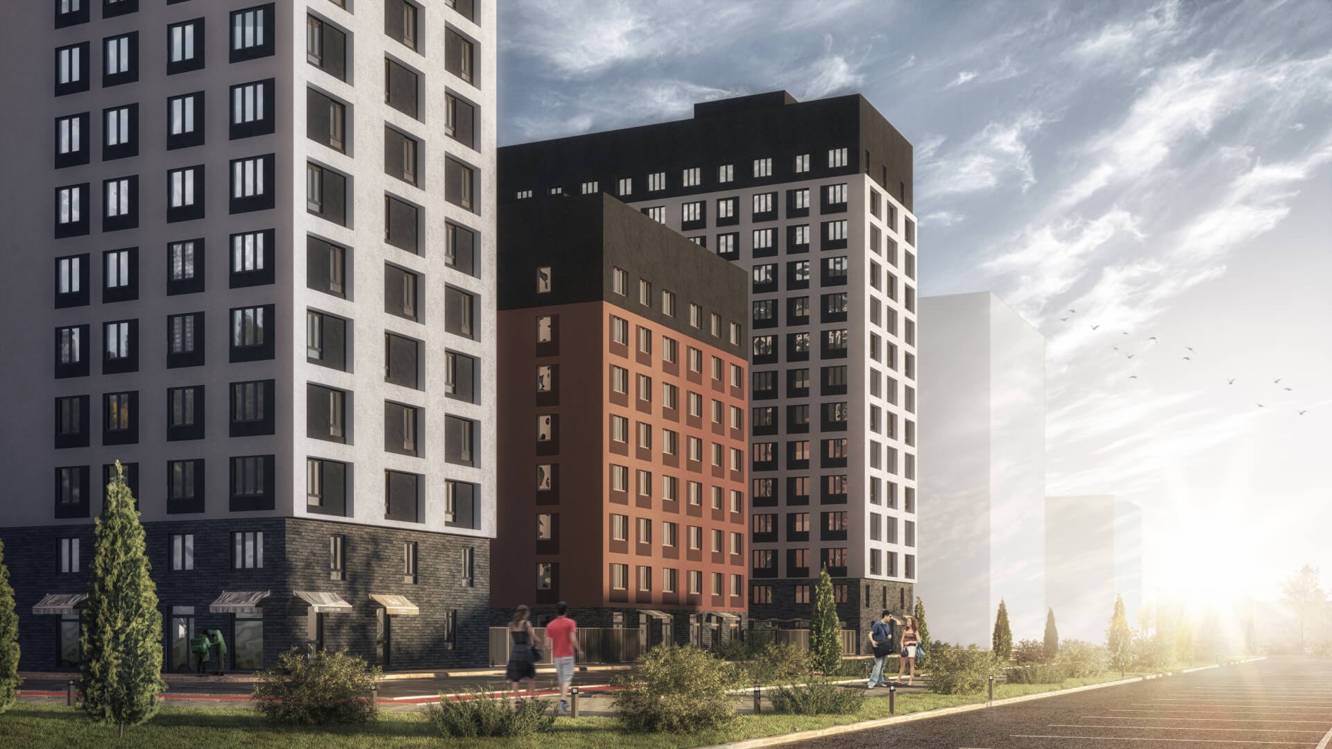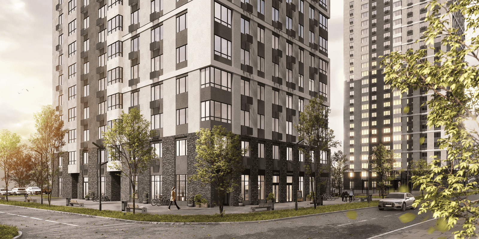 Два новых дома в знакомой локации. У них общий закрытый двор и магазины на первом. Рядом торговый центр, удобные развязки и современная школа.