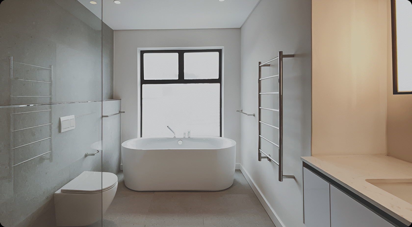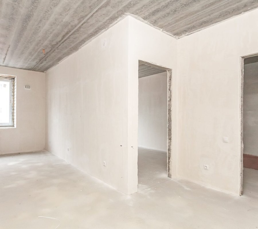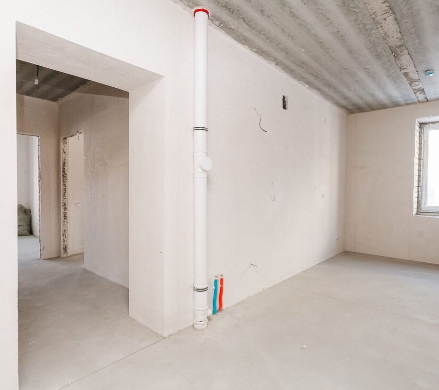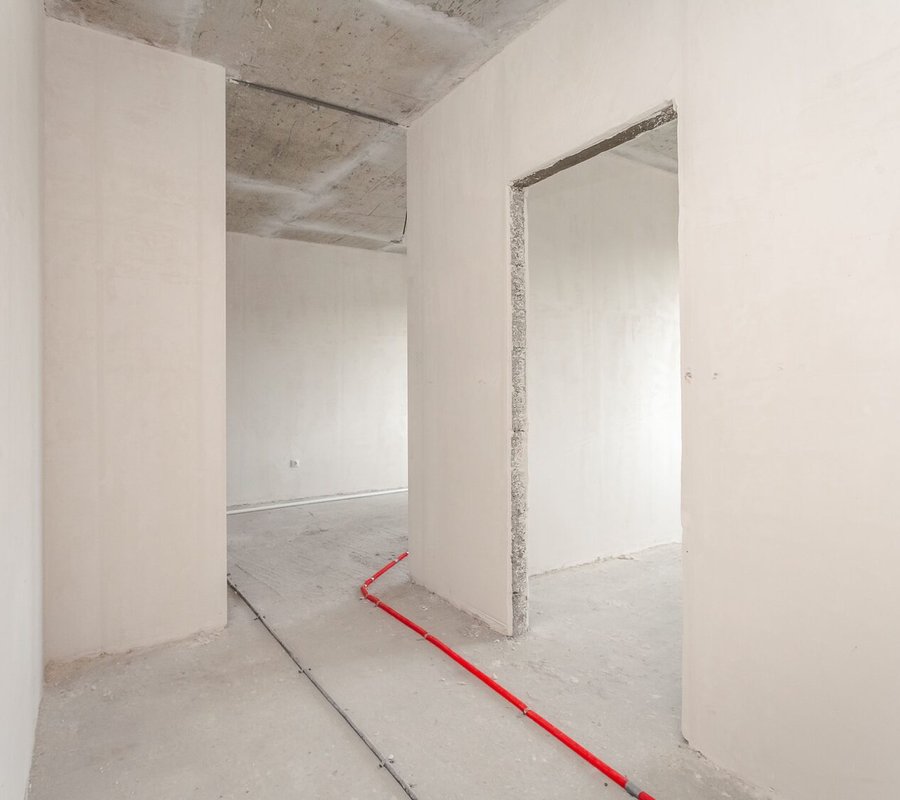 Стены выравниваем по общему уровню и штукатурим. На полу прокладываем слой звукоизоляции и цементно-песчаную стяжку, в мокрых зонах - дополнительный слой гидроизоляции.
