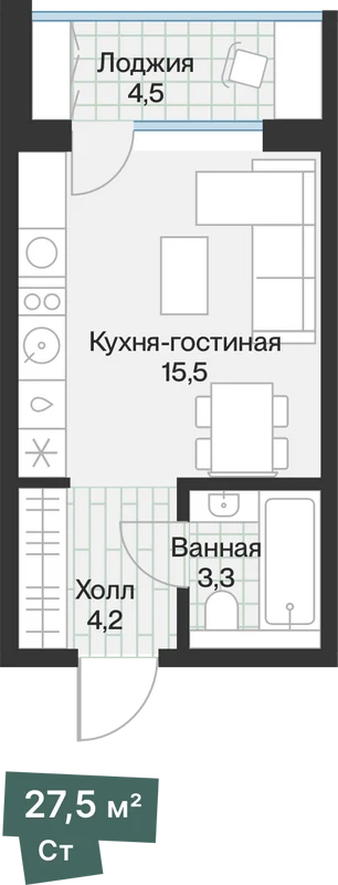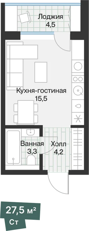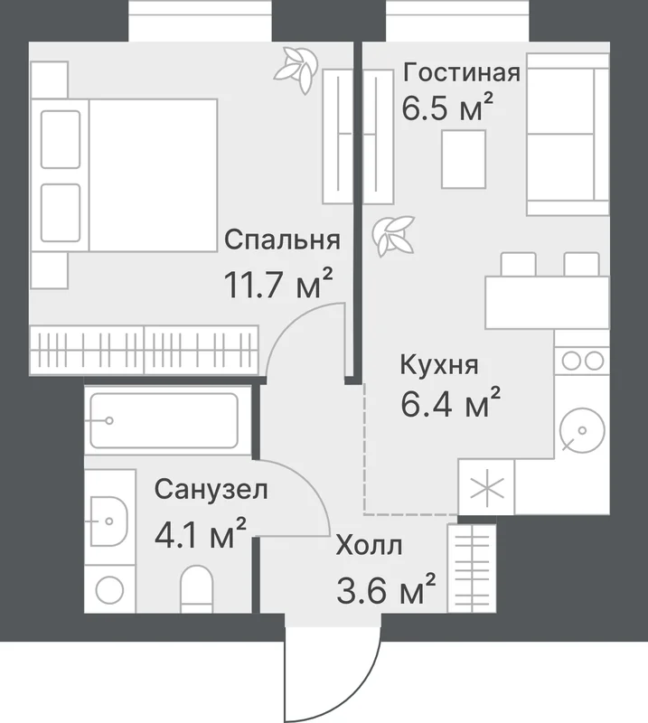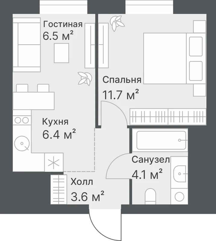 Планировки без лишних метров — хороший вариант для первой покупки. Кухню можно объединить со спальней, чтобы создать больше пространства.