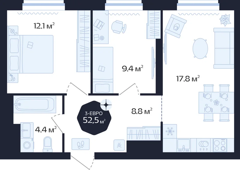 Площадь от 52,9 до 90,7 м²