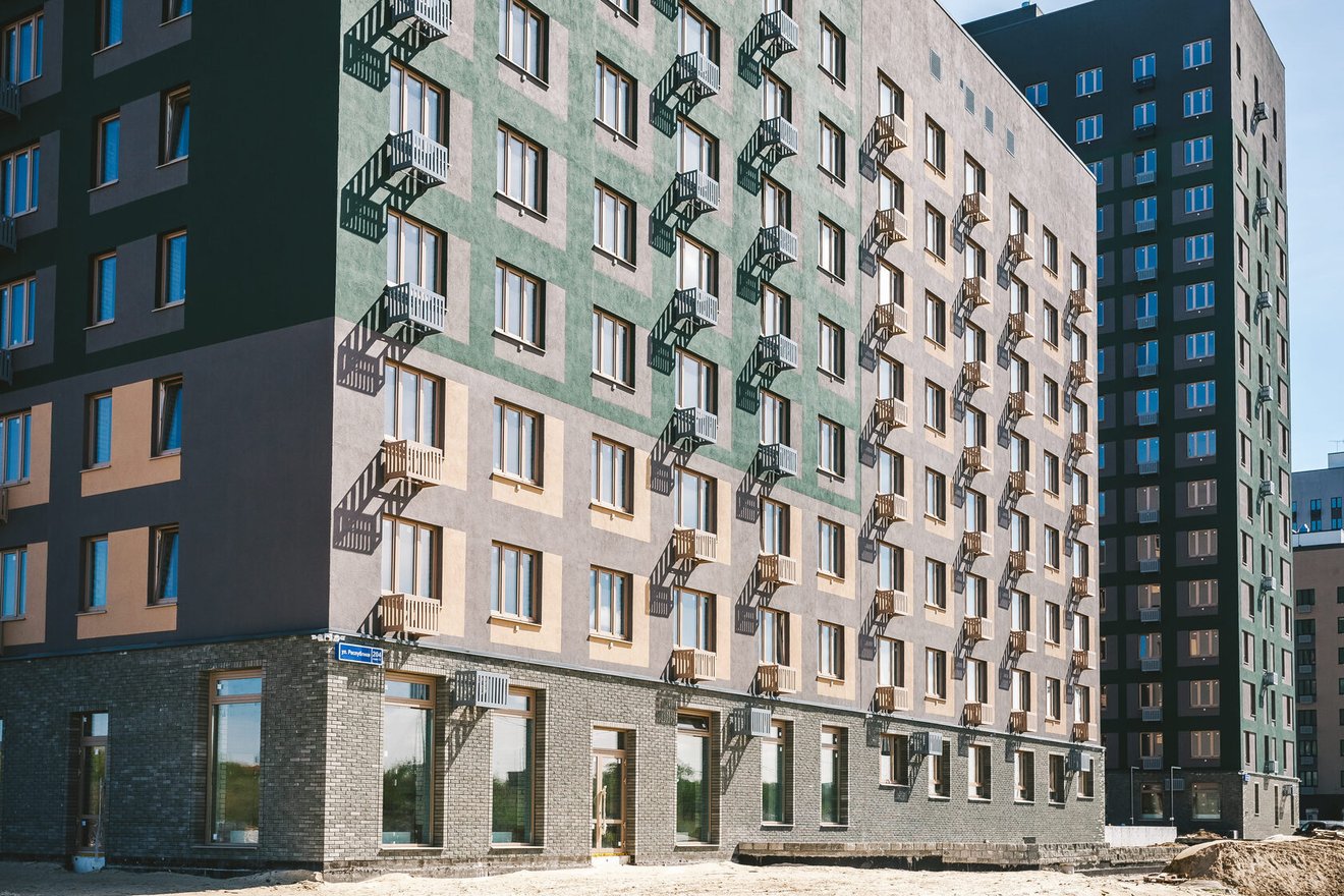 На фасаде Дома на Большой Спасской завершают монтаж корзин для внешних блоков кондиционеров. Идет облицовка элементов внешней входной группы двора. Вокруг ГП-14 продолжается отсыпка придомовой территории и укладка бордюра.