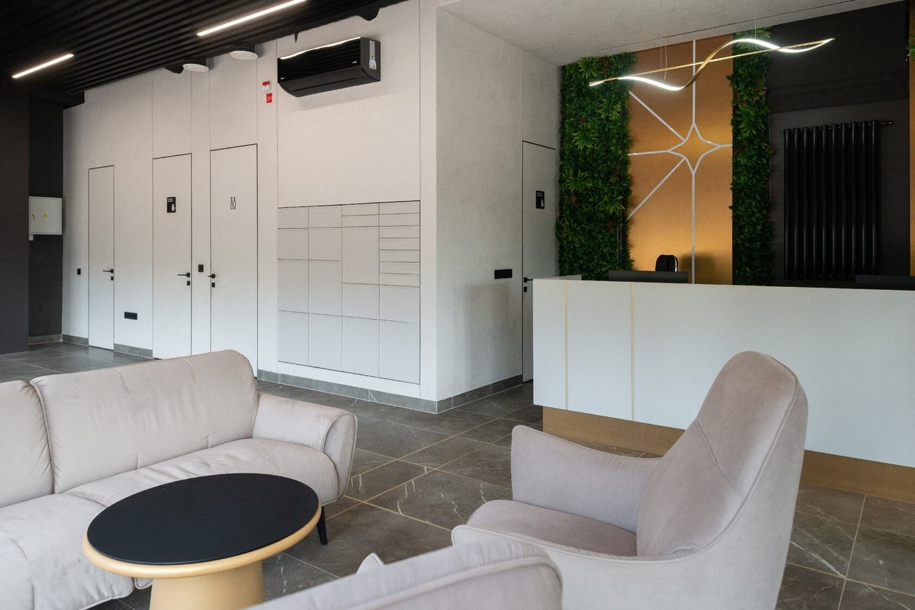 Здесь также предусмотрена стойка для администратора или консьержа, если собственники проголосуют за его появление. Консьерж будет следить за порядком во всем доме, поможет гостям и сориентирует курьера, если тот потеряется.
